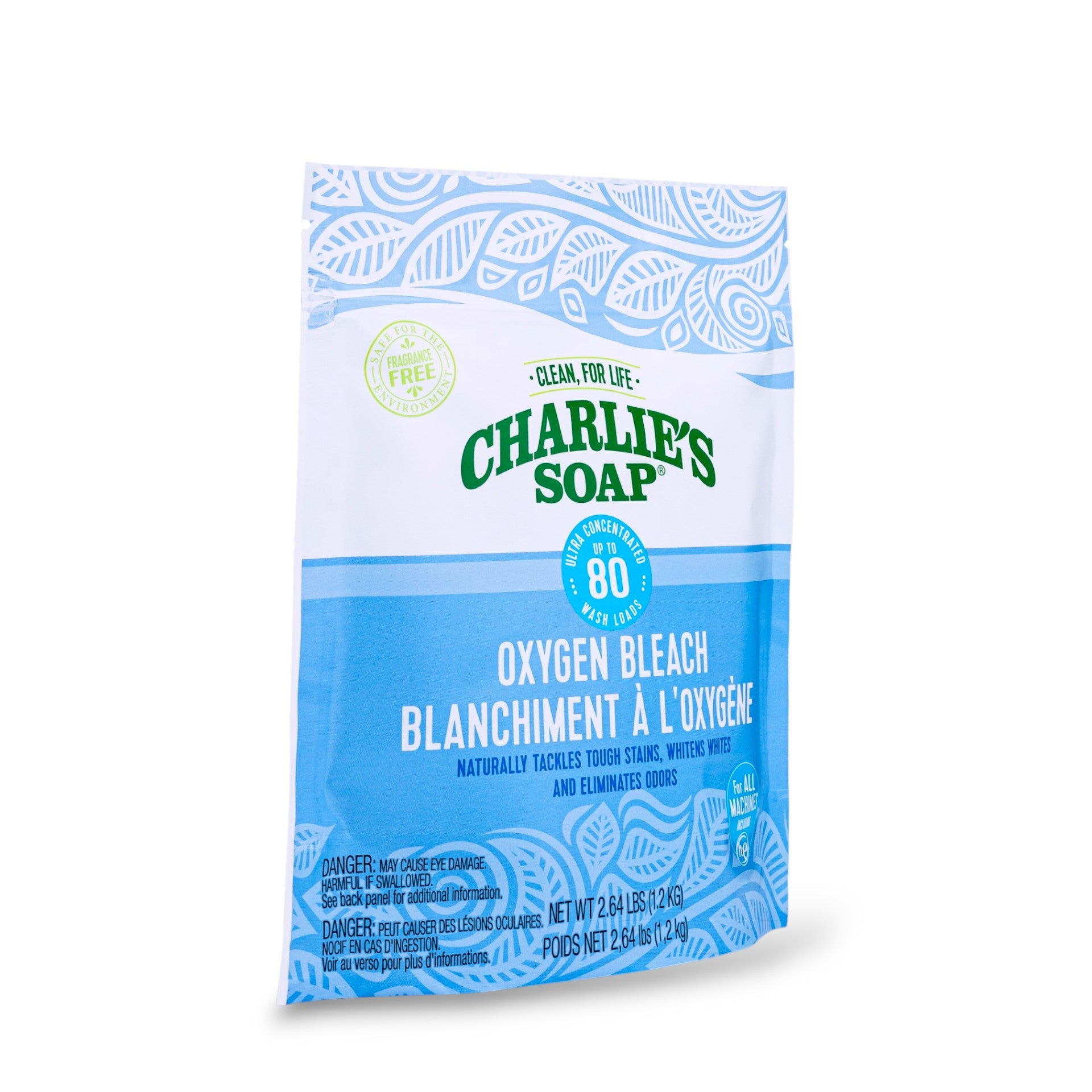 Chlorine bleach is harsh. It works – but is the chance of damaging your clothes and household fabrics worth it? Charlie’s Soap Oxygen Bleach is a breath of fresh air. Our non-chlorine bleach is formulated with washing soda and hydrogen peroxide, which whitens whites and tackles stains and odors – all while being safer for the environment and your septic tank. As little as two tablespoons per load will do the trick.